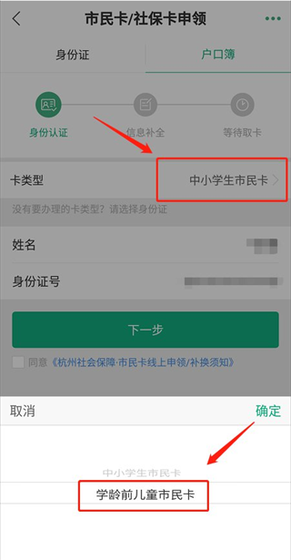 3、选择卡类型为“学龄前儿童市民卡”