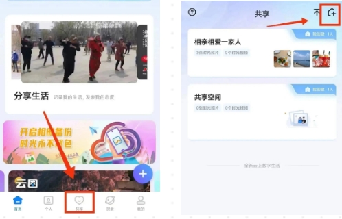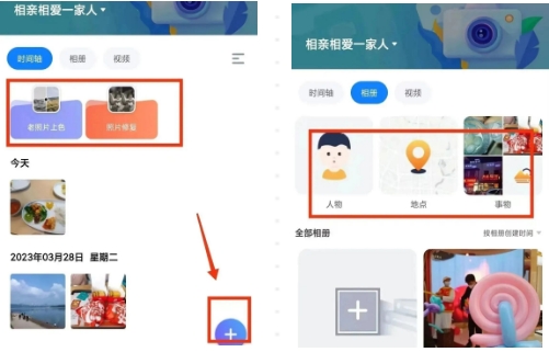 3.共享相册有老照片上色和照片修复功能,点击+号可快速上传照片到共享时光轴,空间成员可见。通过时间轴或按文件类型可对素材进行快速查找。