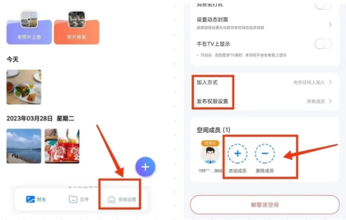 2.点击【空间设置】可添加成员,可输入手机号或扫描二维码邀请家人朋友加入,并设置管理空间权限。