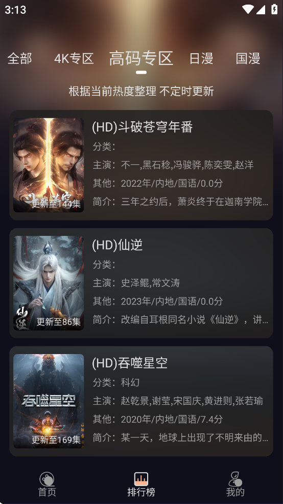 软件首页是各类优秀动漫的推荐,最上方显示了所有动漫的类型,多达十几种。