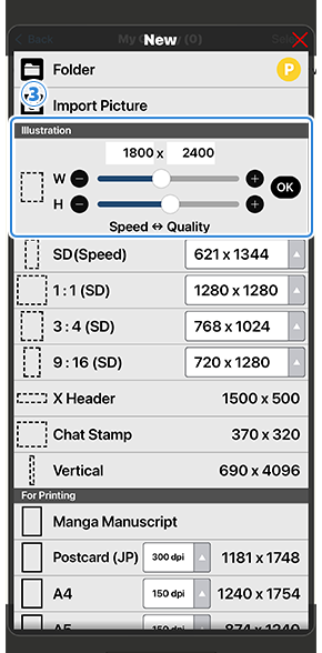 选择 ③[ 任何大小 ]。SD 大小是小画布大小,HD 大小是大画布大小。最大画布大小(像素数)因设备而异。