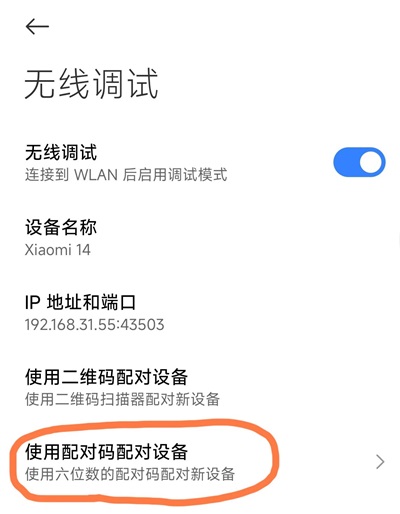 4.在无线调试页面中点击「使用配对码配对设备」