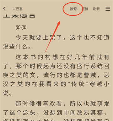 2、在确认进行阅读之后,点击小说阅读页面的屏幕中央,唤起功能列表后点击右上角的“换源”功能,即可更换小说的书源地址。