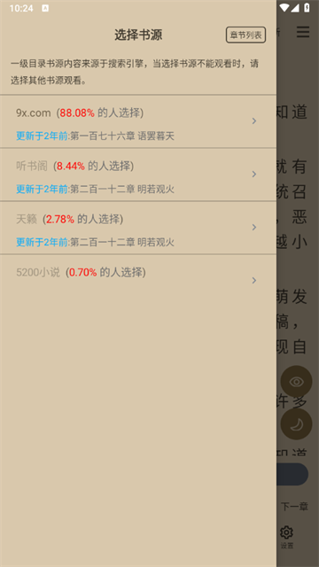 3、这样一来,用户只需要在选择来源的页面里,找到更新快的书源网站,进行点击就可以完成换源,享受好的阅读体验。