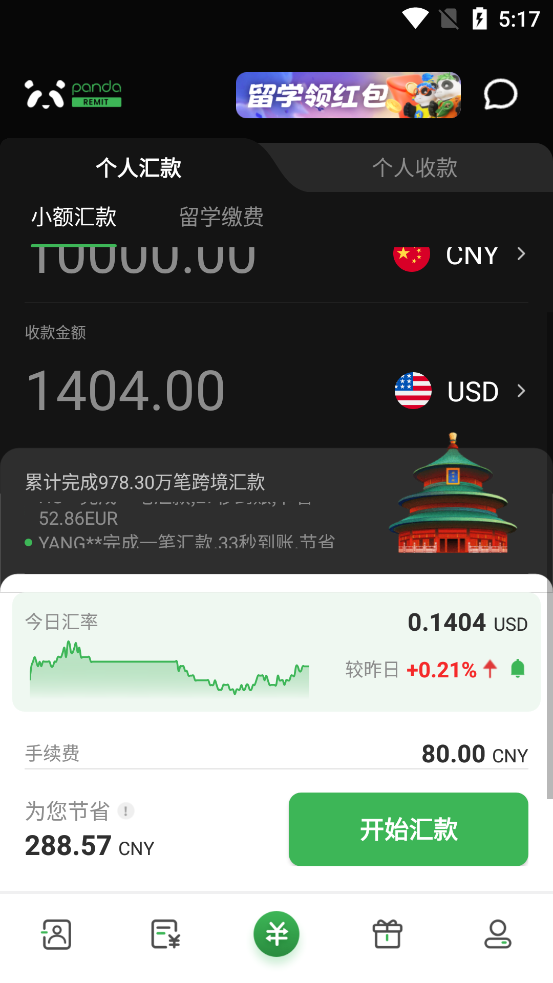 传统银行汇款需要几天时间,而熊猫速汇的到账速度通常在一小时内,效率大幅提升,手续费也更低,并且软件支持40多个国家/地区的汇款。