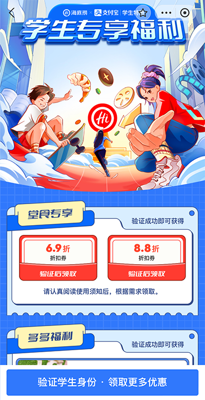 1、首先用户需要打开支付宝,搜索“海底捞”小程序,点击进入高校学生验证专享