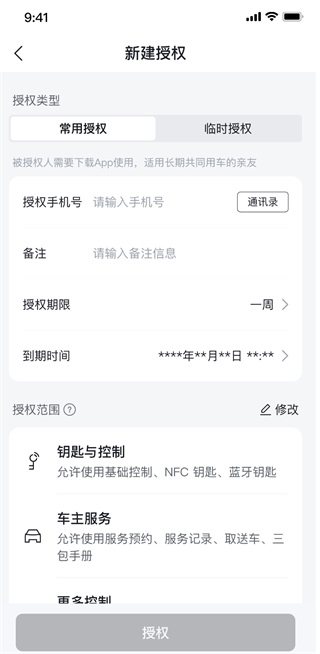 3.填写被授权人注册的手机号码,选择授权期限、授权范围(包括钥匙与控制、车主服务、更多控制、隐私功能可以按需选择),点击确定并完成相应的验证后即完成授权。