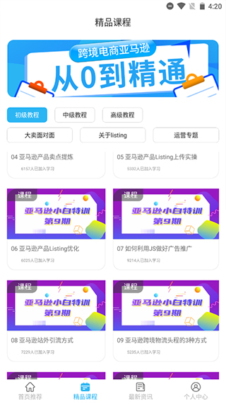 亚马逊跨境电商教学app是一款专为零基础卖家量身打造,带你全面系统了解亚马逊的教学平台。软件内有着大量的教学视频供用户观看,不管你是小白还是行业头头,在这里都能找到你想要的专业知识。软件中拥有上百条亚马逊卖家基础技能,以概念和场景化讲解、健全的知识结构为中心,细化到每个实操关键点,讲解如何选出小爆款并运用一些手段迅速打造到首页或前三页位置。同时软件内还有着很多亚马逊的最新资讯,让用户能够更好的了解每天的时事热点和相关事件。