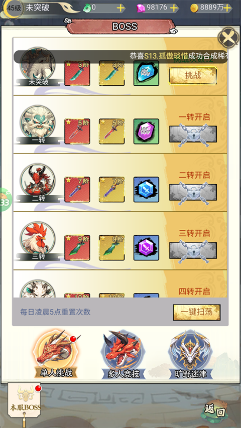 4、战力变强后就可以参与BOSS挑战了,包括单人、多人、矿野迷津副本,挑战后还可以直接扫荡获得丰富的奖励。