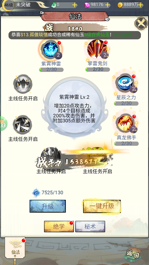 2、如果挑战关卡失败的话可以升级一下绝学和秘术,境界也要突破进阶一下,这样就可以继续闯关了。