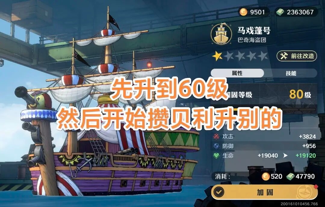 前期建议只把船拉到马戏蓬号60级,越到后期贝利越不够用,升级船真的太吃贝利了!然后活动出的那些能用金币买的船,都推荐购买。