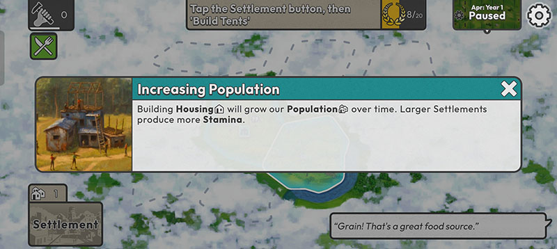7、通过时间积累资源,逐步建造房屋以提升人口数量。人口的增长会让定居点规模扩大,并带来更多体力产出,为后续发展提供更强支撑。