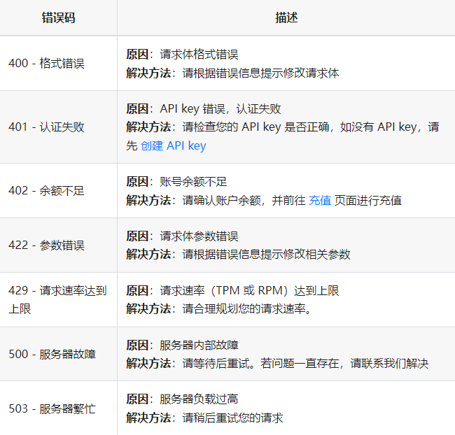 您在调用 DeepSeek API 时,可能会遇到以下错误。这里列出了相关错误的原因及其解决方法。