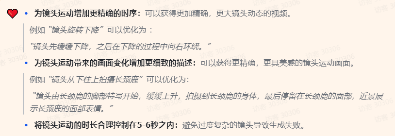 Prompt精确公式适用于对于镜头运动或画面呈现有明确需求,需要更加专业视频输出物的用户,准确细致的Prompt能够提供更加准确、更具美感的视频画面。