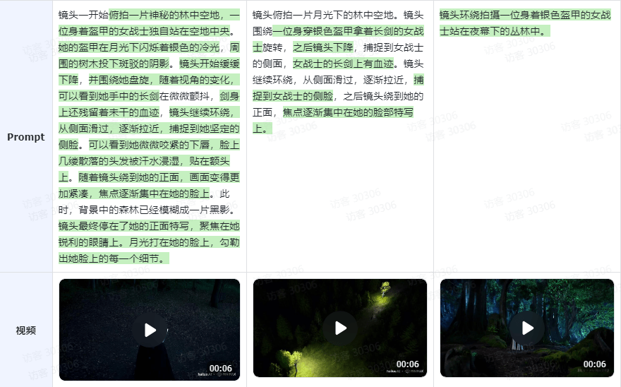 下面的示例展示了增加【镜头时序】和【镜头运动带来的画面变化】描述所带来的结果。