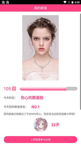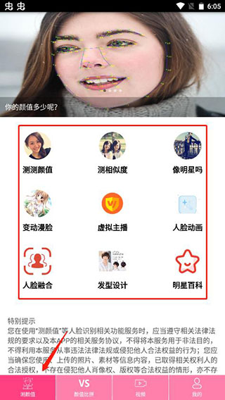 4、为您提供颜值的官方评测,通过人脸识别技术,识别出人脸72个特征点,进行大数据分析,返回官方颜值结果。