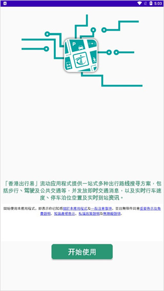 1、首先进入香港出行易app,点击开始使用,选择你使用程式的模式;
