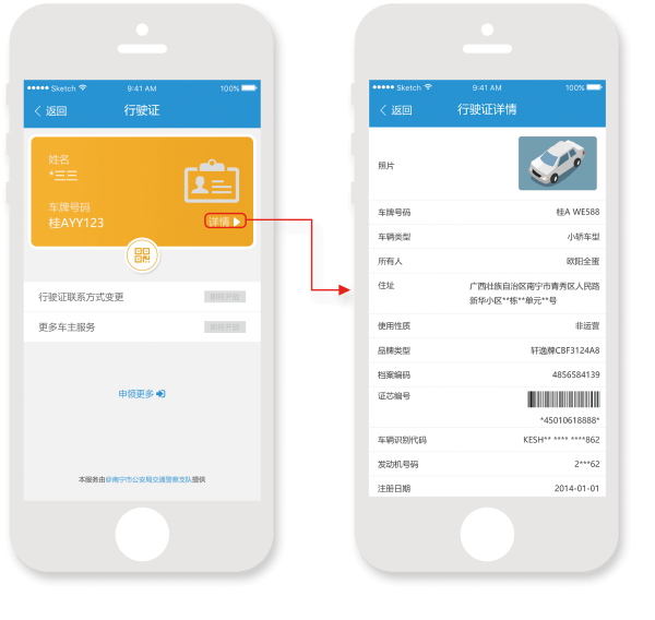 实体行驶证的在线化,与个人身份信息绑定,为用户提供车辆信息在线认证等服务。