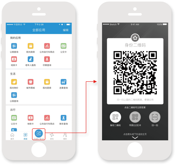 快捷扫码和支付功能入口,功能包括身份二维码、公交二维码、地铁二维码和扫一扫。