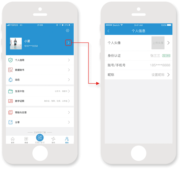 3、个人中心目前开通个人信用、数据秘书、动态消息、数字证照、生活卡包功能;