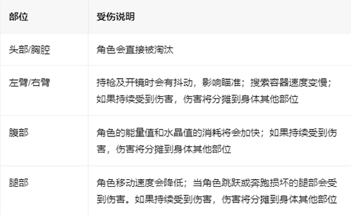 游戏中健康系统与其它射击游戏有很大区别,根据受伤部位、伤势的不同,会有不同的表现。除了头部之外,其它部位如果损坏后继续受到伤害,那么伤害将会分摊到身体其它部位。在暗区内或者暗区外都可以对角色进行治疗,角色不会自动恢复健康状态。