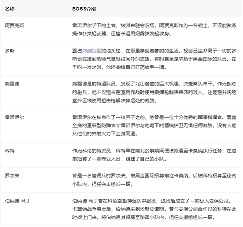多斯;视自己生命高于一切的多斯会在嗅到危险气息时拉闸呼叫支援,有时甚至是求助于黑金国际的雇佣兵。在千钧一发之时,他还会给自己打药放手一搏。(可能出现地点:海滨别墅)