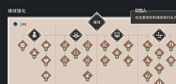 在击杀敌人后会获得道具魂球,魂球可以购买秘宝、道具、甚至是加一些基础属性,由于基础属性不会因为死亡而被清零,因此新手优先攒混球升等级。推荐加点顺序:初始金币、卡牌商店必出打折、神秘商店必出打折秘宝、上次挂掉的章节可以获得少量遗产、血量、增加重置战斗、放弃战斗结束有卡牌金币补偿和其它。