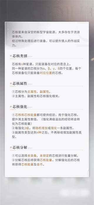 3.芯核的加成很多,但现在还不到养的时候,至少要开启第六层才能获得璀璨芯核,只养璀璨的,到后期应该完全不缺芯核,所以除了四个词条(不包括主属性)的都没有必要养,而在这些四个词条的芯核中优先养增伤词条多的,暴击、暴伤、虚弱增伤以及攻击,这些占有两个词条以上就可以养了(当然升级的时候是有可能歪属性的哈)