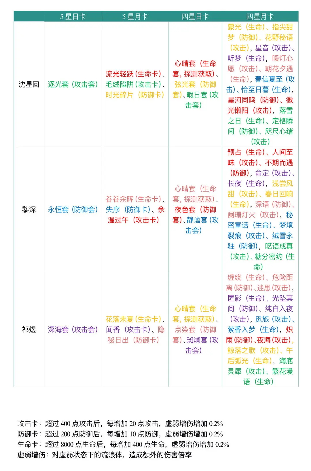 1.目前所有关卡都有限时,大部分关卡还限制血量,所以速战速决是第一要义,也就是要尽量提高攻击,所以攻击卡必养(除了心晴套是探测获取,其它均为许愿获得,日卡只能许愿,月卡可以在商店换,以下统计不包括限定、星盘、密约卡)