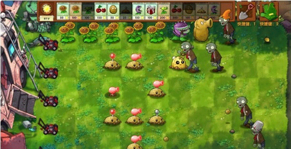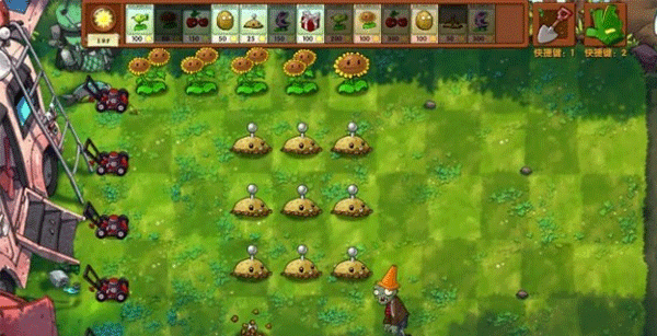 2、使用高于向日葵高度的坚果保护一路,其他路可以都种上“豌豆土豆雷”和“豌豆坚果墙”。