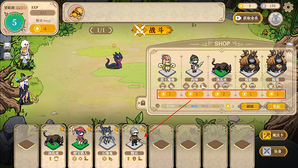 3、在游戏中,右侧提供购买棋子的选项,三个相同的棋子还能合成升级为更高星级。