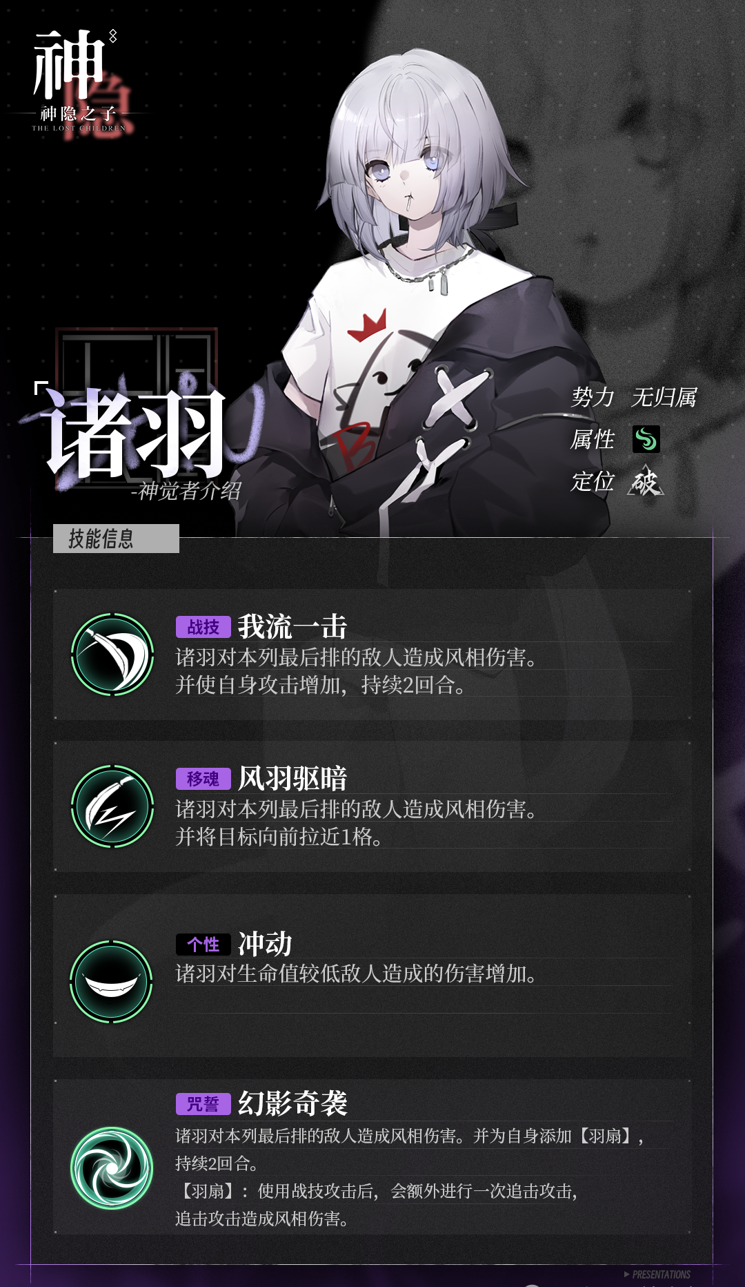 最初相遇的时候,代理人并没有带给诸羽非常好的印象,毕竟面对自己这般大人物(自称),代理人居然毫无反应,属实令人感到“费解”。但随着羁绊的加深,她逐渐对事务所有了更多的牵挂,也对代理人有了完全不同的看法。大大咧咧的外表下,隐藏着诸羽想和大家一同前进的梦想。