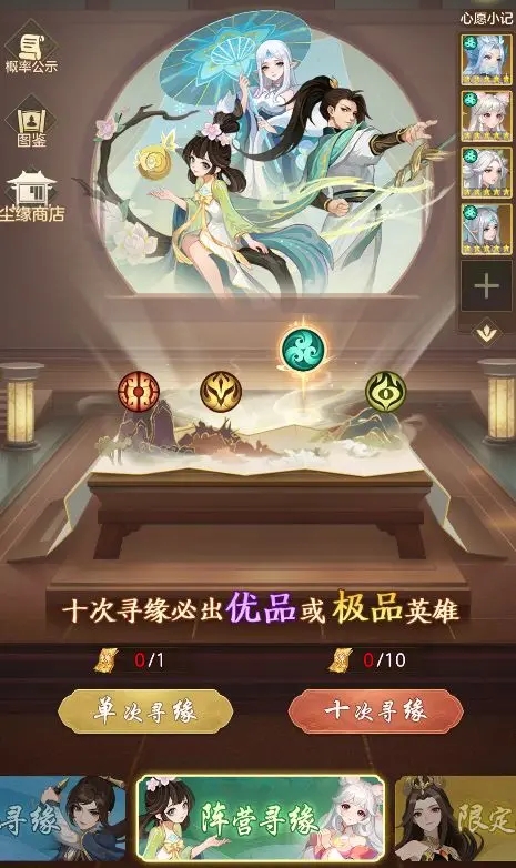 游戏中的“寻缘”包含了多种类型,如最基础的“天地寻缘”、只会抽到选定阵营的“阵营寻缘”和能抽取天庭与洪荒两种高级阵营英雄的“限定寻缘”。