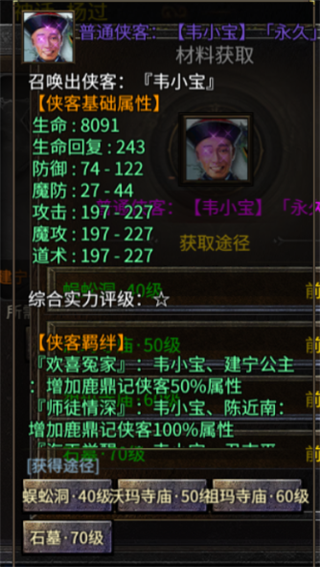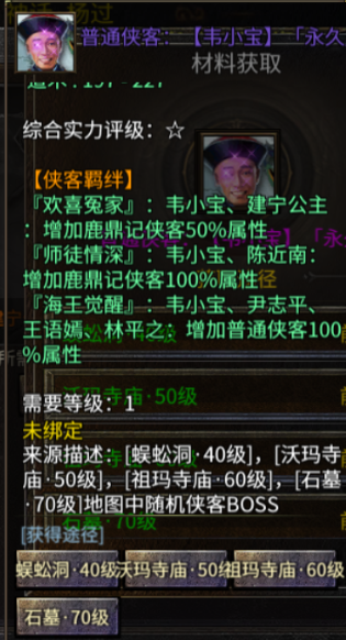 在游戏过程中,50级的主线任务完成后将会开启侠客系统,我们会获得游戏中的第一个侠客——韦小宝。然后在70级的时候,会开放跟侠客息息相关的另一个系统,也就是今天要介绍的图鉴系统。