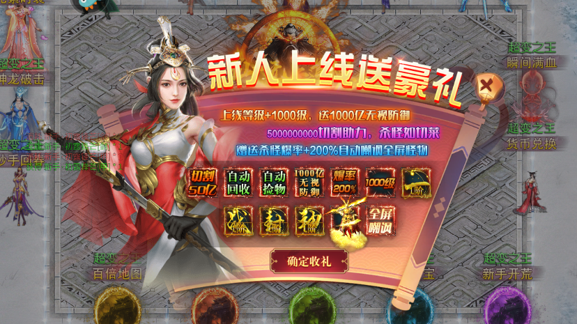 1、新手玩家首次登录即可享受丰厚礼包:50亿切割属性和1000亿无视防御,让您轻松击败敌人;自动拾取和回收功能让您挂机无忧;全屏嘲讽buff助您轻松聚怪,帅气的猴哥时装更是让人眼前一亮。