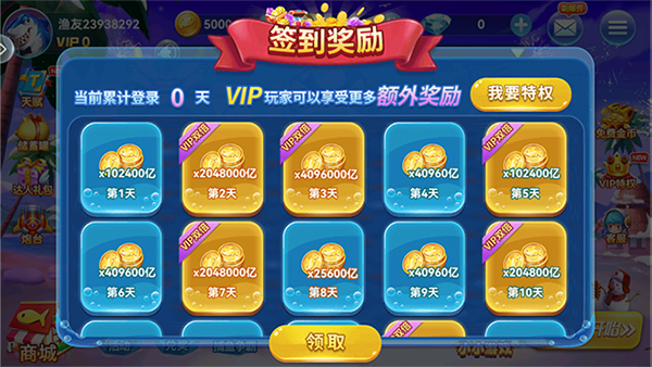 1、上线就能领取大量的金币和其他道具;