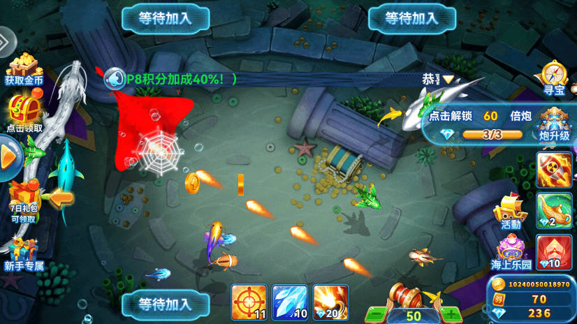 1、炮台的使用倍率直接关系到捕捉效率。刚进入游戏时,可以用低倍炮捕捉小鱼预热,节省金币。当BOSS鱼出现时,再切换到高倍炮,集中火力攻击,既能最大化收益,又能稳扎稳打地获取奖励。