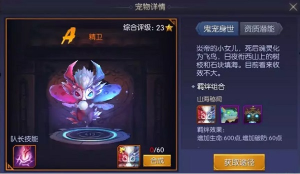 2、输出型:橙宠建议初期以精卫为队长,队长技能为自身生命值低于50%时,触发暴伤暴击的提升,辅B级应龙和夜明作为羁绊,形成生命值破防的增加;中期搭配上河伯开启双羁绊效果,以破防为主,另外增加攻击;后期再搭配红宠财神,财神的队长技能既能降低伤害又可以回复生命值,保证输出的持续性。
