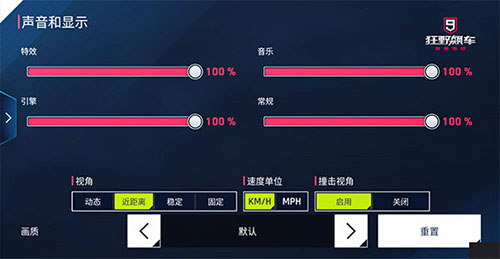 声音和显示当中,可以调整特效、引擎的画面效果,以及音乐和常规音效的声音音量。对视角要求高的玩家还可以分别从“动态”、“近距离”、“稳定”以及“固定”四个视角进行选择。