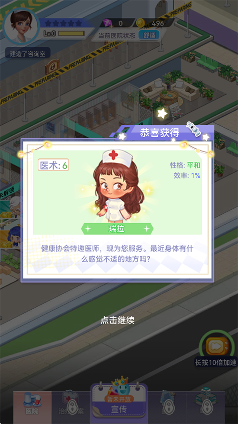 通过解锁和建造更多的科室来扩展医院空间。选择“咨询室”建筑进行操作,可以扩展排队扩容。
