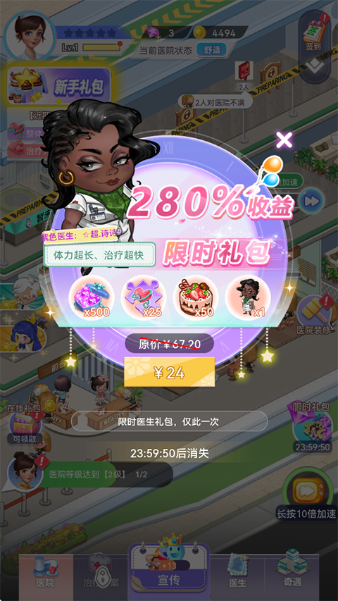 大胆行使管理者的权力,任命医术高超且具有奇特天赋的医生医治病人(通过电击加快病人的就诊速度等),同时解雇医术过低的医生,以免他们治疗后,病人情况变得更加严重。综合考虑医生的天赋能力,合理的安排医生前往不同的科室,这会让科室的治愈效果得到极大提高。