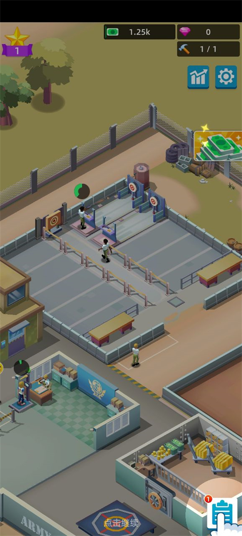 各种场地等着你来解锁!射击训练、障碍训练、室内目标射击、巷战、拳击、轰炸等一应俱全。您需要做的就是点击并升级它们,使用您赚到的现金来投资和升级您的基地,解锁不同的训练物品,提高声望,扩大和发展您的军队,并建立一个强大的军队商业帝国!