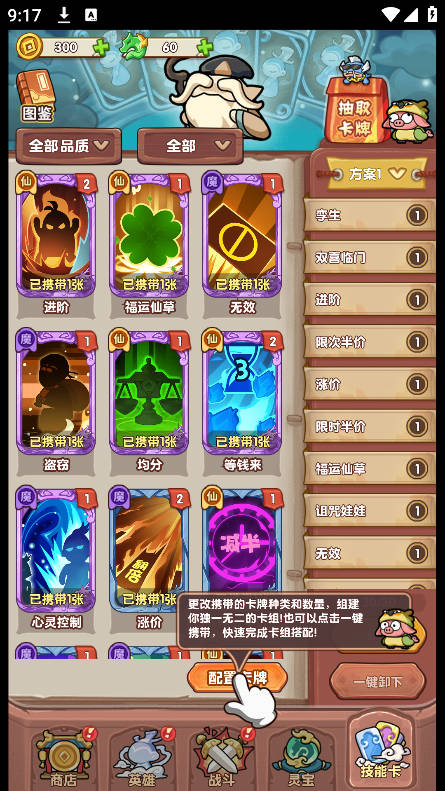 1、在开始战斗前,先进入[技能卡]页面,点击[配置卡牌]挑选自己需要的卡牌。也可以选择一键携带,快速配置完卡牌前往战斗!