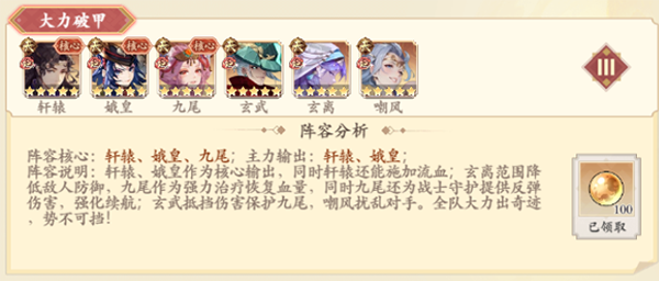 能抗能打,属于是六边形的配队,非常全面,这个配队主要就是轩辕,一定要尽所有的办法把轩辕提到最高星,培养非常好只会推图pvp都是前期无比强势的情况,后续的就是慢慢把阵容补起来,阵容方面可以把玄离和嘲风根据应对的阵容换成女英或者龙龟,龙龟对燃烧队会有更好的效果,在爬塔闯关的时候双奶阵容会非常强势,后期可以拿到(神)轩辕以后,双C轩辕是很勇猛的玩法,面对任何阵容和玩法是可以靠自身的强度应对!