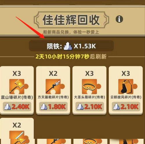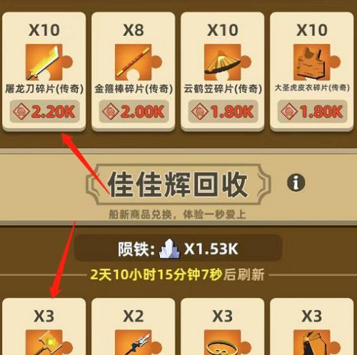 在回收界面我们看到,达叔回收和佳佳辉回收里面都有传奇装备碎片,集齐一定碎片数量就能合成传奇道具。如图所示