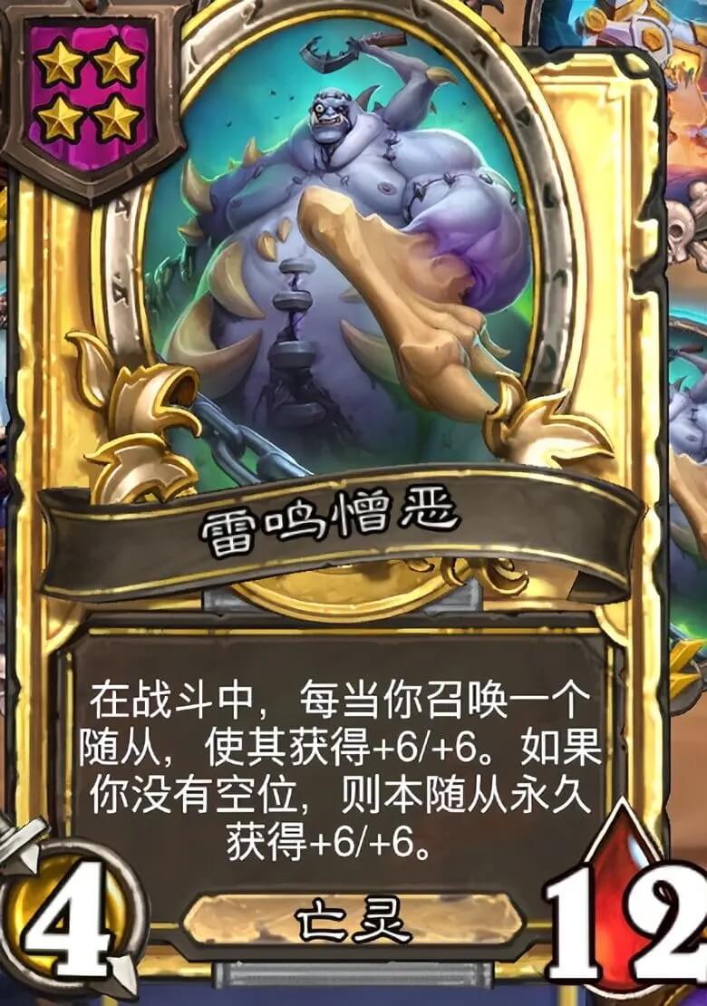 雷鸣憎恶是亡灵战力的核心卡,效果是在战斗中召唤随从会加3/3,如果没有空余格子,自身会加3/3,合金之后效果翻倍。不仅能配合亡灵的亡语和复生,BUFF召唤的小亡灵,稳住血线,而且在后期体系成型之后,自身身材也能优先破千,快速形成战力。我们在玩亡灵的时候最好是多在四本呆一会儿找到雷鸣憎恶锁血,这张卡在中期来的越早越好,如果长时间不来中期亡灵战力会小很多,这时候就不推荐大家玩亡灵了,硬玩很有可能老8。