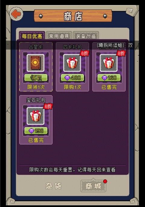 新人一定要注意哦。钻石一定一定不要乱用,这里推荐性价比比较高的使用指南,那就是购买商店的每日优惠这里有两个礼包,双倍礼包和宝石礼包,个人推荐每天可以买一个宝石礼包,双倍礼包可以不用买,毕竟看广告也可以获得双倍药水。