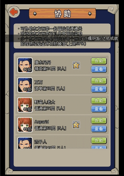 协助里那个有五角星里面写个2的就是有双倍BUFF的房间,点击协助,进去白嫖吧!!!最后,钻石在前期的主要作用就是提升背包与仓库容量,所以不要乱花哦,两个都升级到最高容量可以在成就里领取两个很厉害的技能哦。
