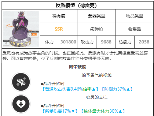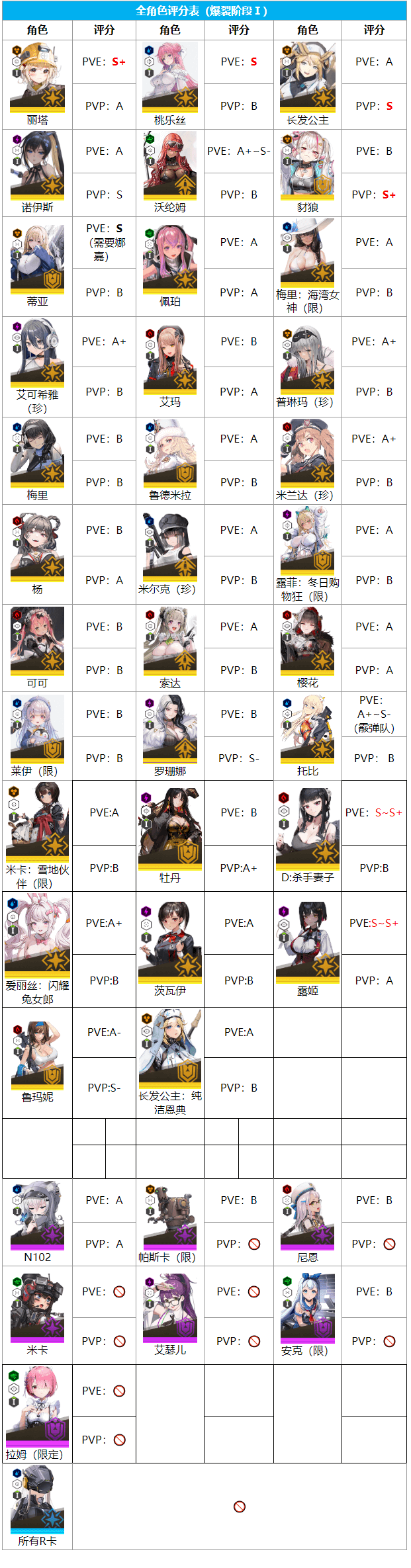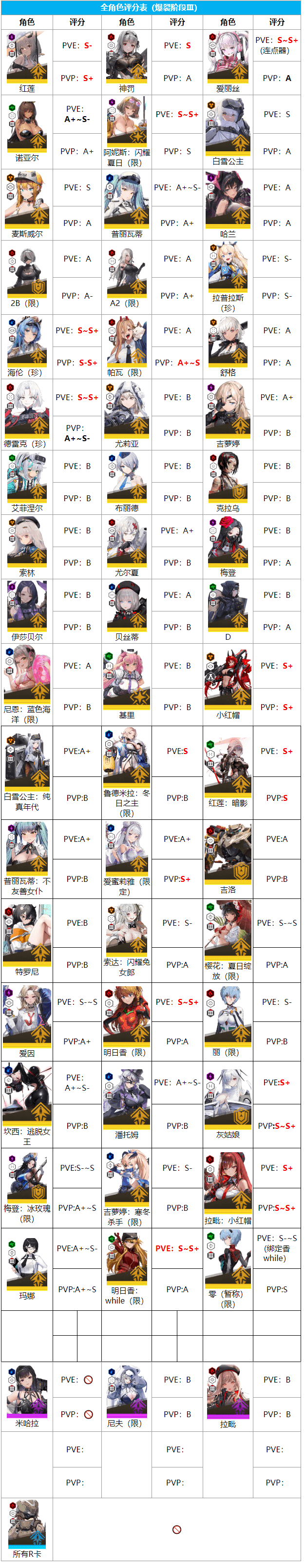 特殊评分:ex (与某些妮姬锁死绑定 例如黑白兔 黑白jk 这类型的角色在一队时会有加倍效果 目前游戏的EX角色强度为s以上)