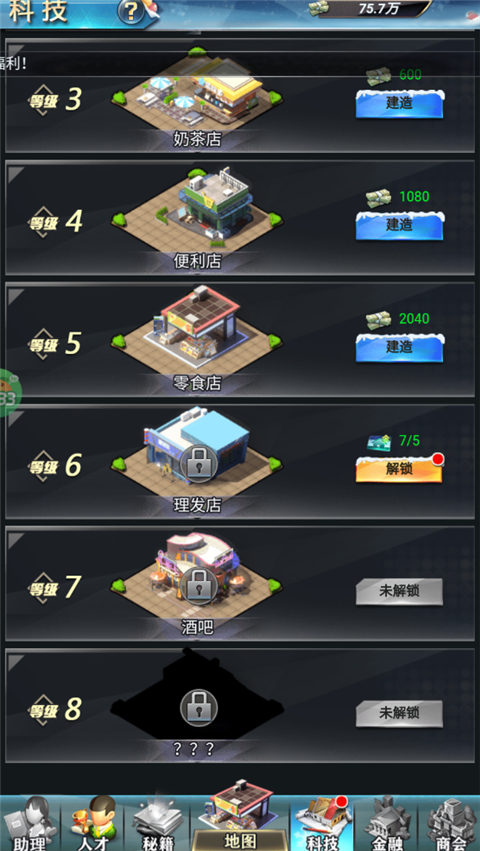 3、在科技界面中,你可以解锁更多种类的店铺,扩展你的商业帝国,探索新的盈利机会。